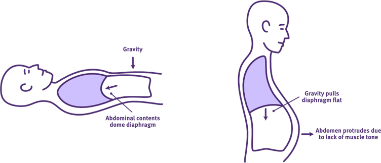 - reduced diaphragm efficiency due to altered chest wall and abdominal muscle tone and compliance