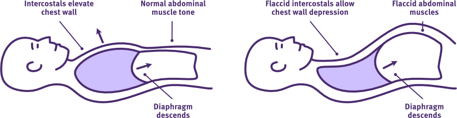 In addition to amplifying any weakness or paralysis of the intercostal and abdominal muscles, muscle function is further impaired by the presence of flaccid tone and increased compliance.