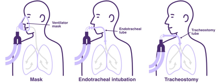 Ventilation support includes use of positioning and mechanical ventilator devices—often continuously—to normalise gas exchange, stabilise the airway, and reduce the overall work of breathing.