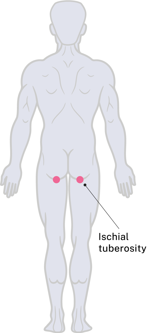 Below is an illustration highlighting the common sites of skin breakdown in people with spinal cord injury (SCI). Use the illustration below to identify the affected body part. Then, use the body parts listed in the menu on the left to access general advice on: